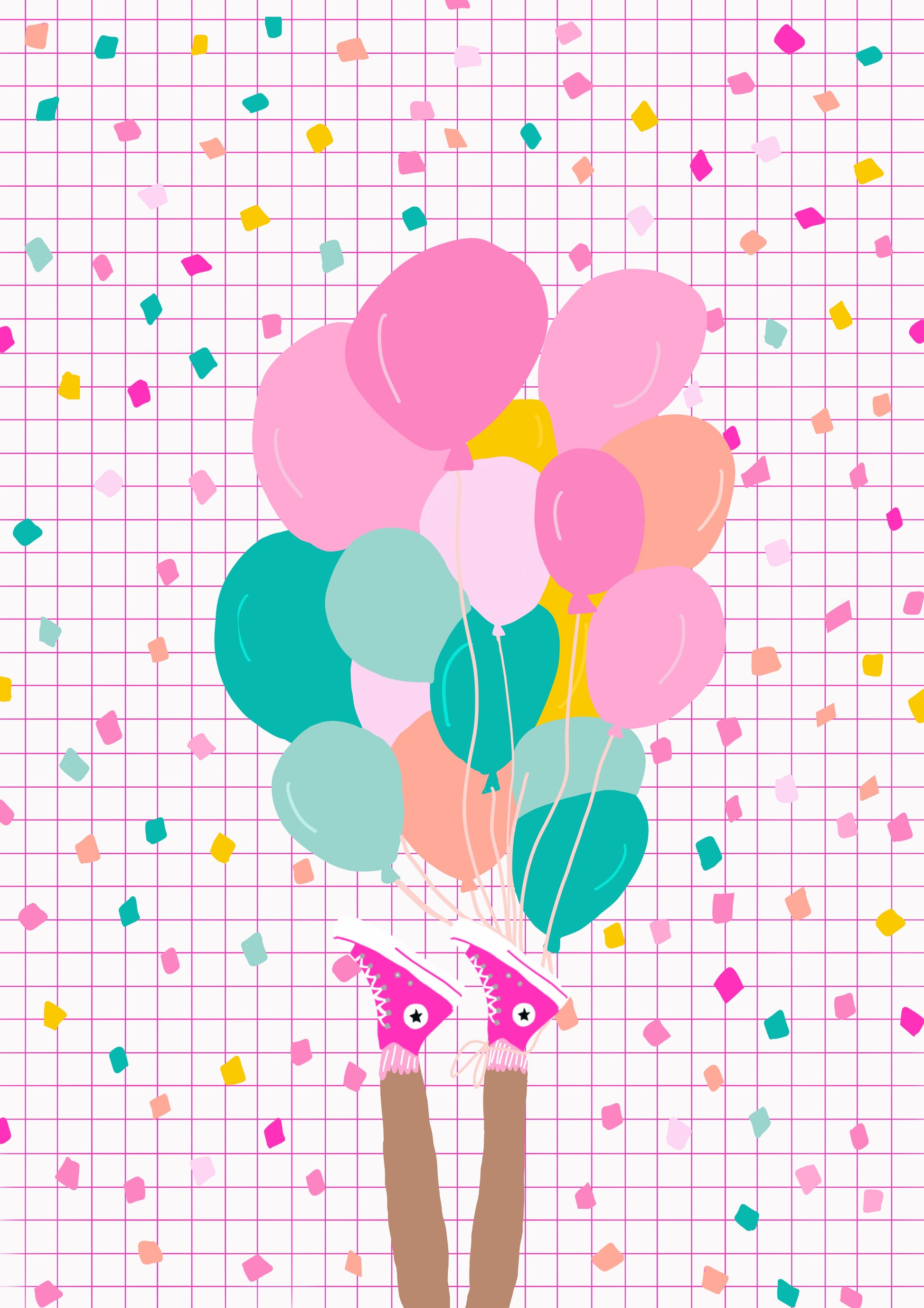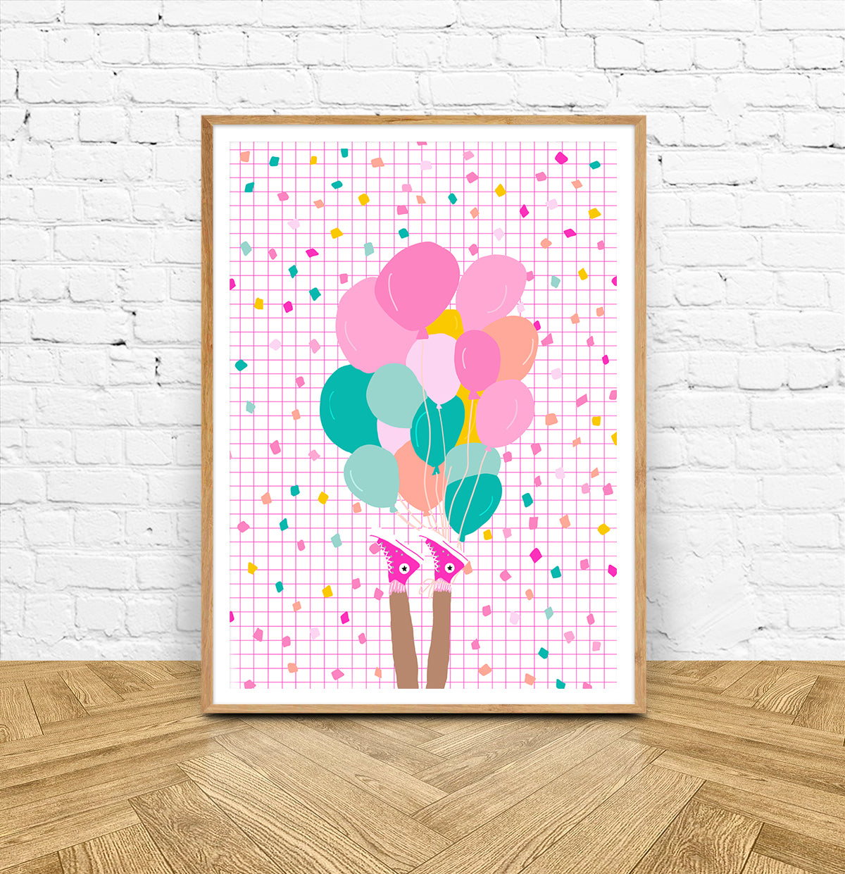 Just hang in there! A whimsical print featuring, balloons confetti and cute sneakers. The perfect to brighten up a room.