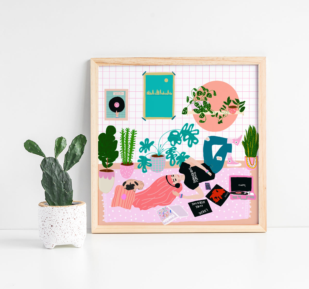 Girl listening to music and chilling. I created this illustration as part of a "draw this in your style challenge" I love creating little interior spaces and including all the little details that make up the characters personality. All of the details in this one are close to my heart and this girl has pretty rad hair!